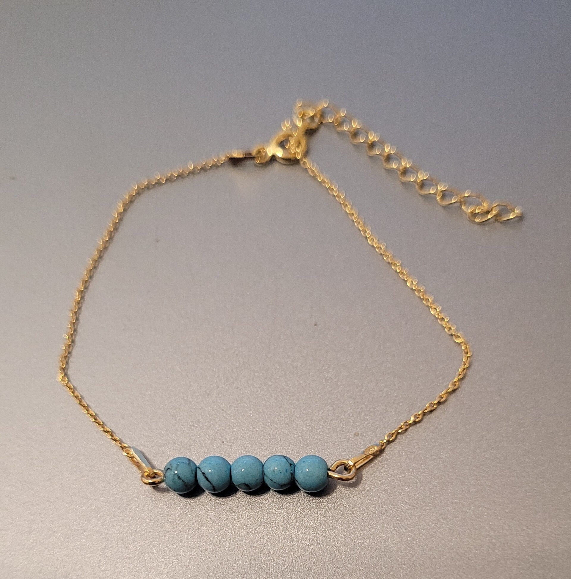 Bracelet en plaqué or réglable 17,5cm et 4cm chainette d'extension véritables perles naturelles en pierre gemme turquoise.