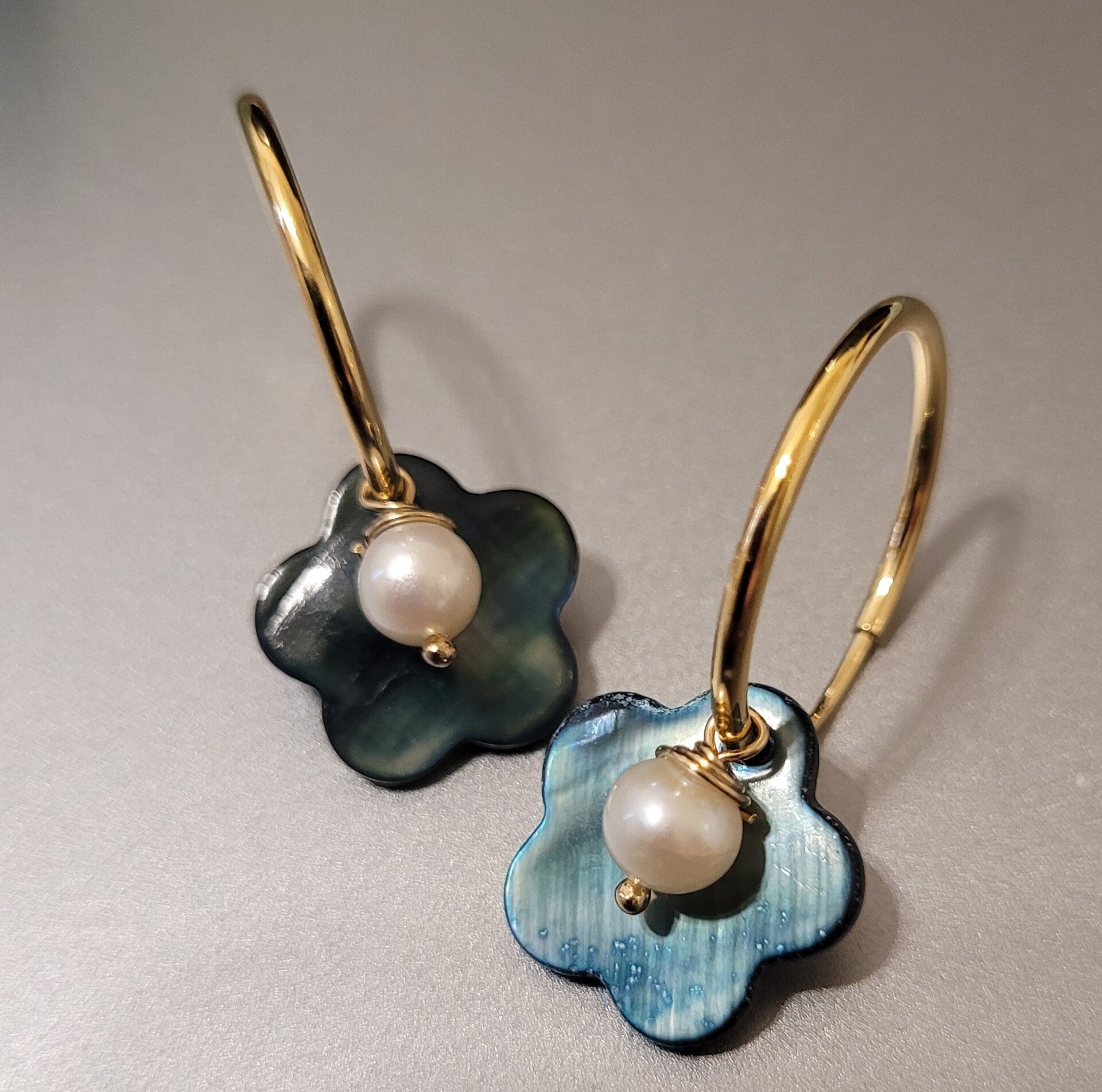 Boucles d'oreilles créoles 21mm en plaqué or véritables perles de culture d'eau douce et véritable nacre.