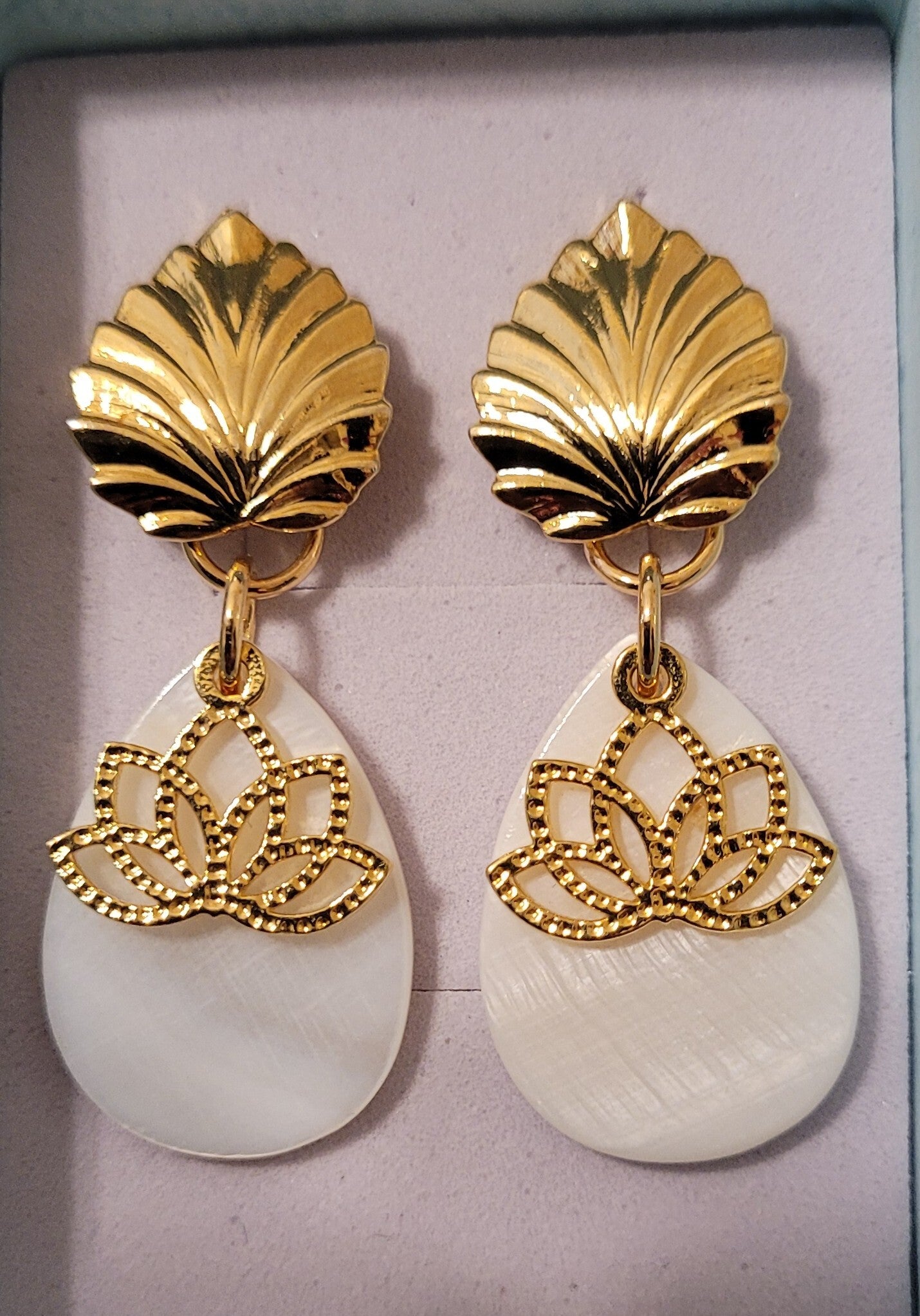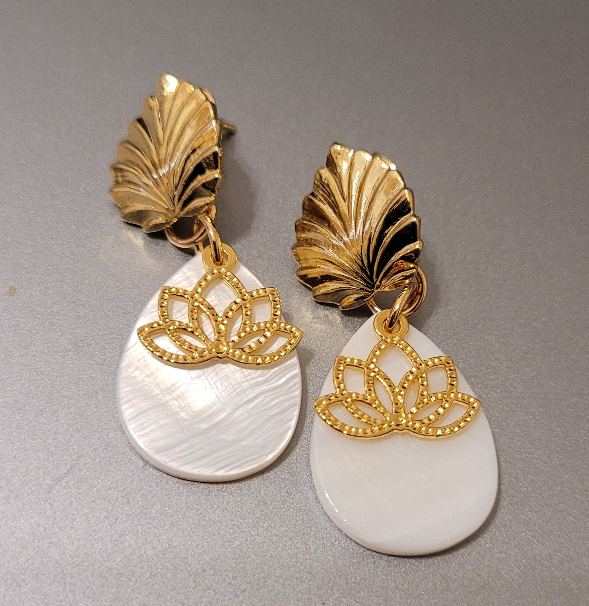 Boucles d'oreilles pendantes en plaqué or véritable nacre et breloques en plaqué or. Fermetures : poussoirs en plaqué or.