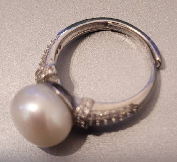 Bague en argent 925 ajustable de la taille 54 à 60 véritable perle de culture d'eau douce blanche qualité AAA et zircons.