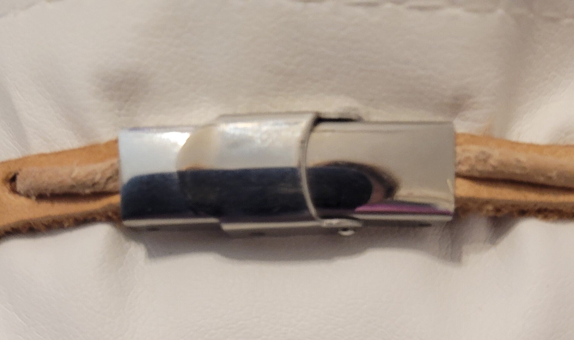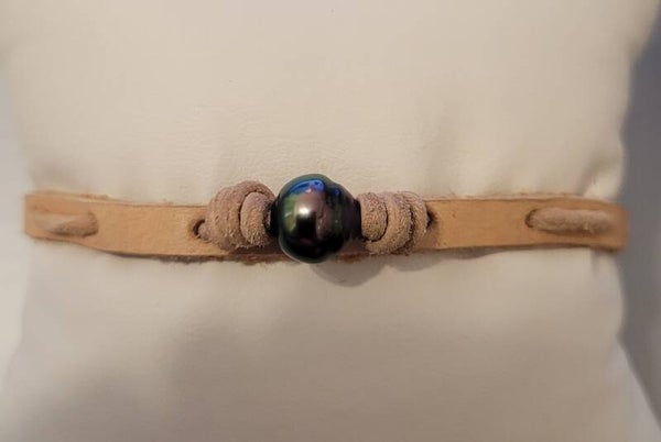 Bracelet en cuir naturel 21cm perle de tahiti cerclée couleur paon diamètre 8/9mm qualité B très beau lustre fermoir en acier inoxydable.