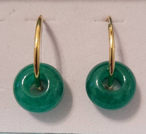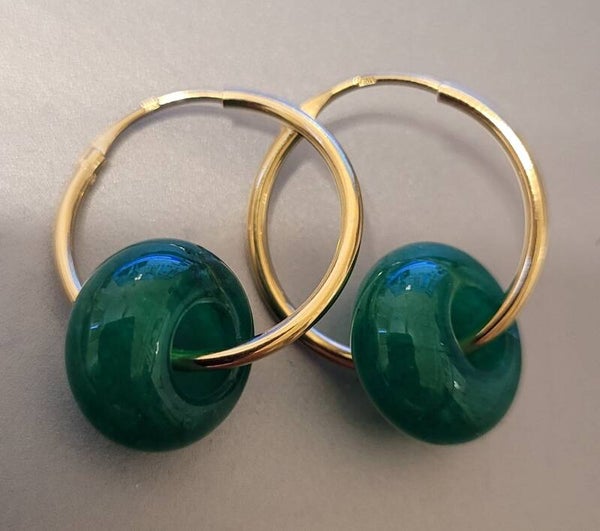 Boucles d'oreilles créoles 21mm en plaqué or véritables perles gemme jade.