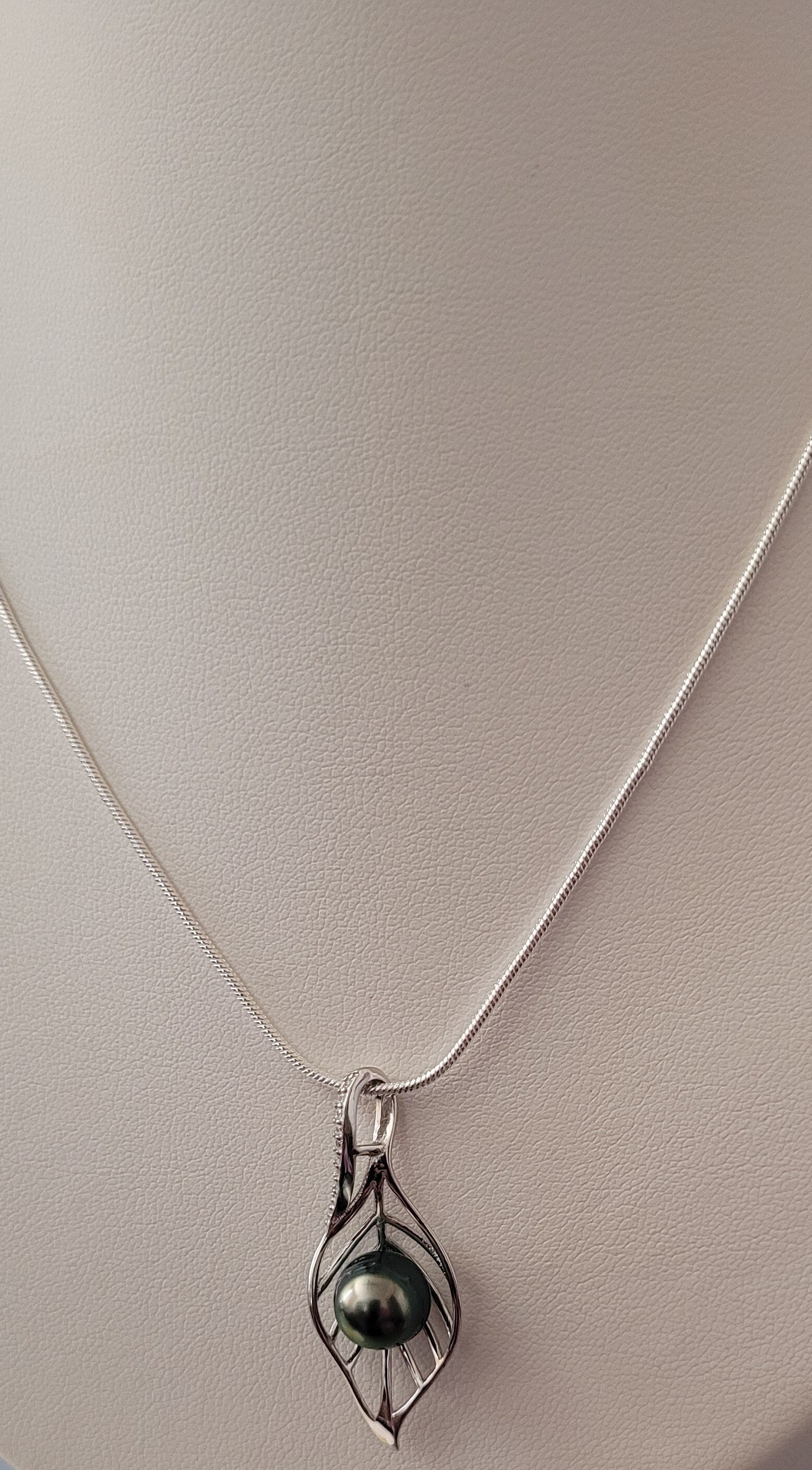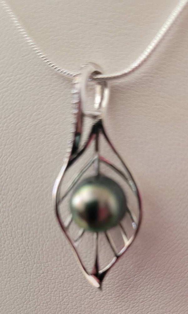 Collier 45cm en argent 925 pendentif véritable perle de tahiti cerclée couleur paon diamètre 8/9mm bon Lustre qualité C et zircons.