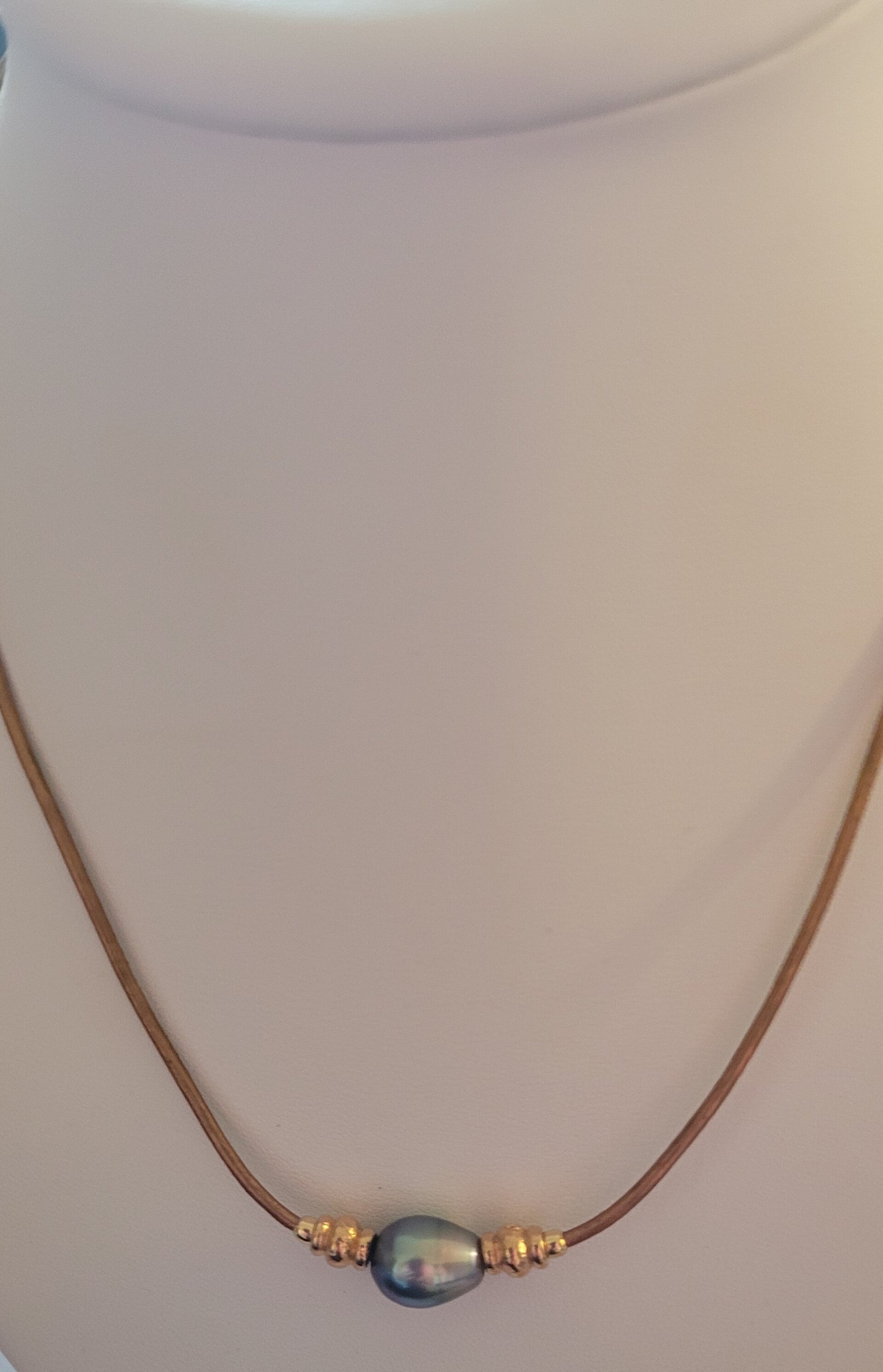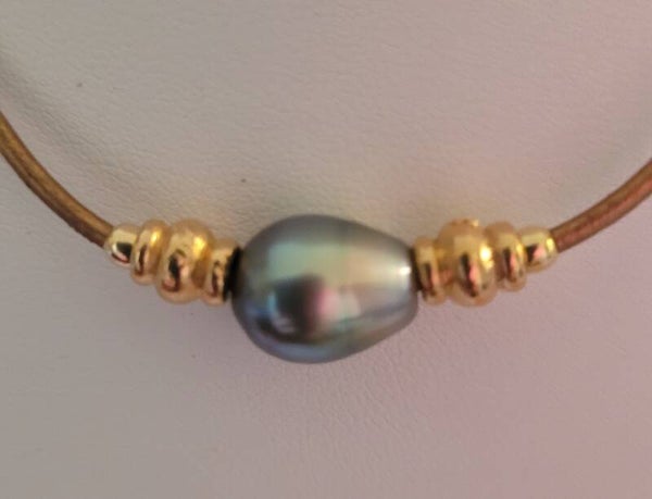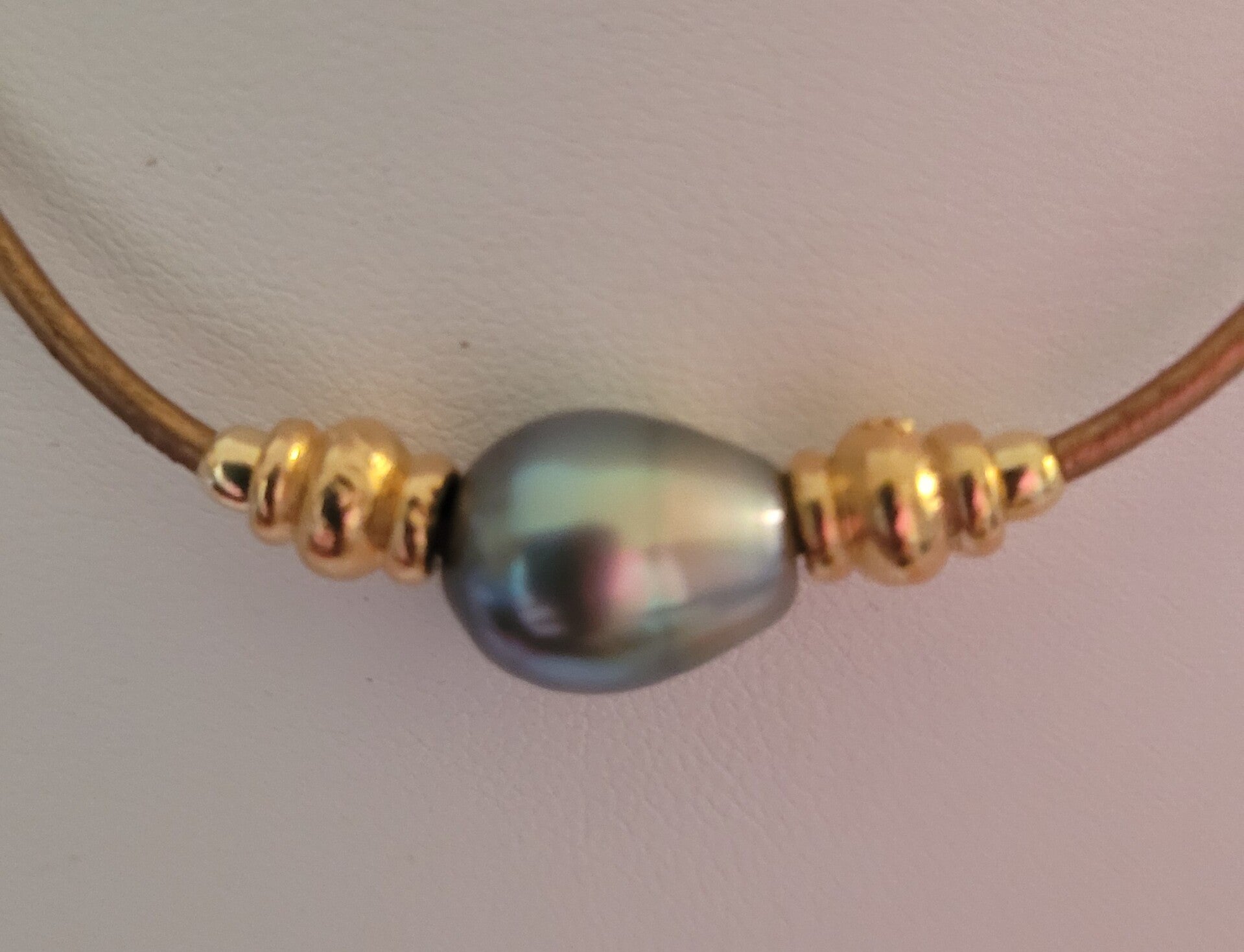 Collier cuir bronze métallisé 47cm véritable perle de tahiti couleur gris argenté diamètre 9,5mm qualité B très beau Lustre et perles en plaqué or fermoir mousqueton en plaqué or.
