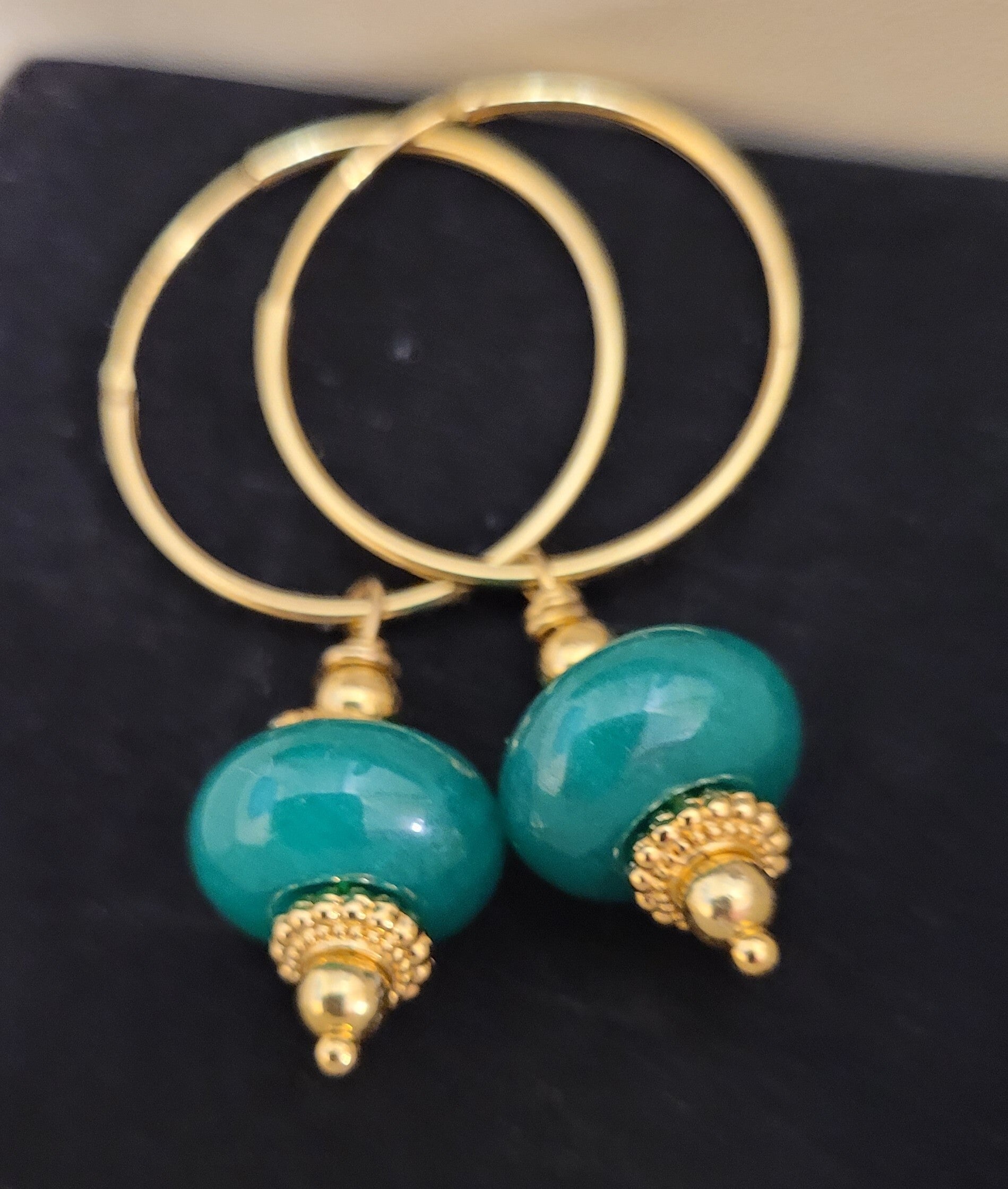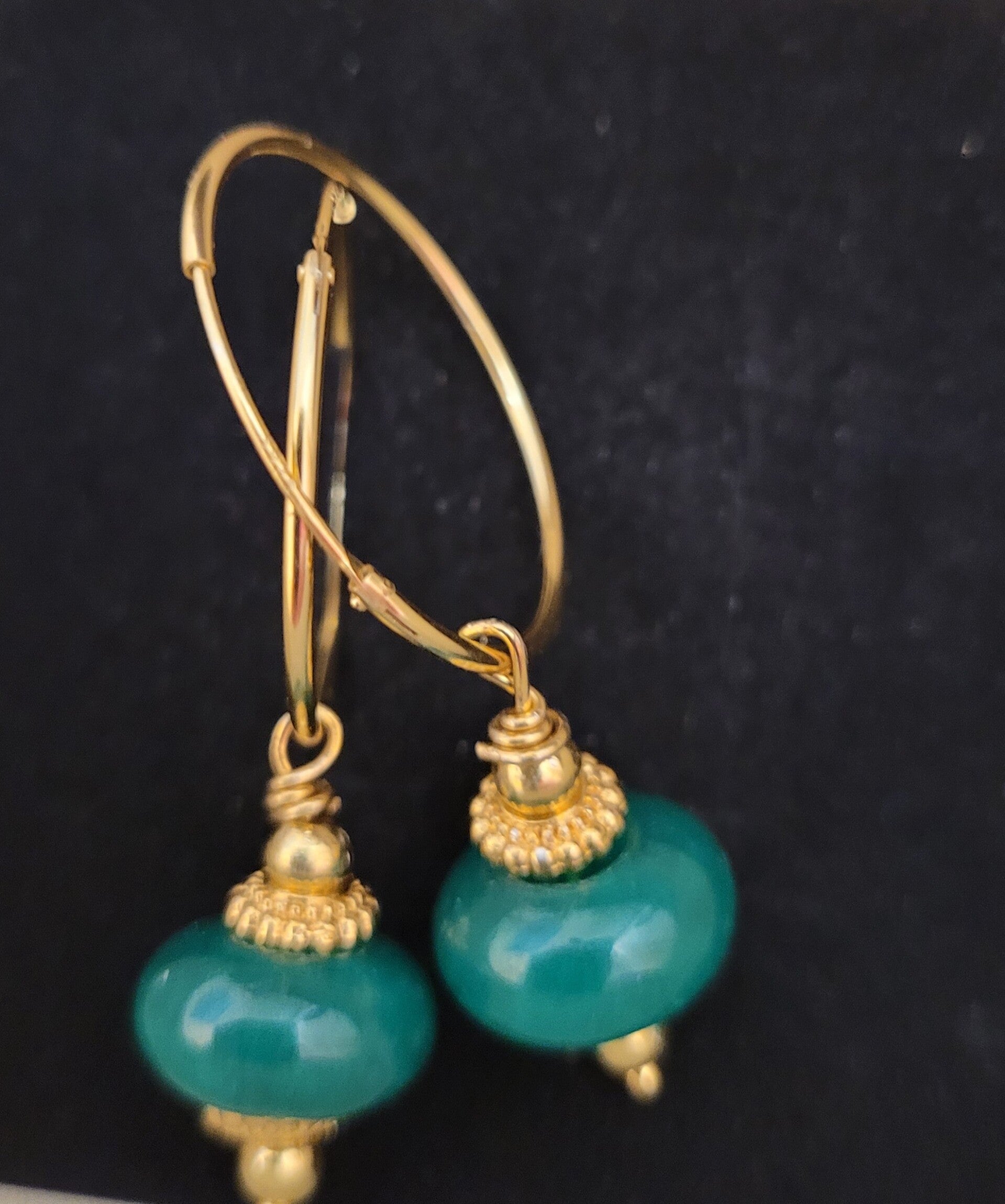 Créoles 24mm en plaqué or véritables perles pierre gemme jade et perles plaqué or