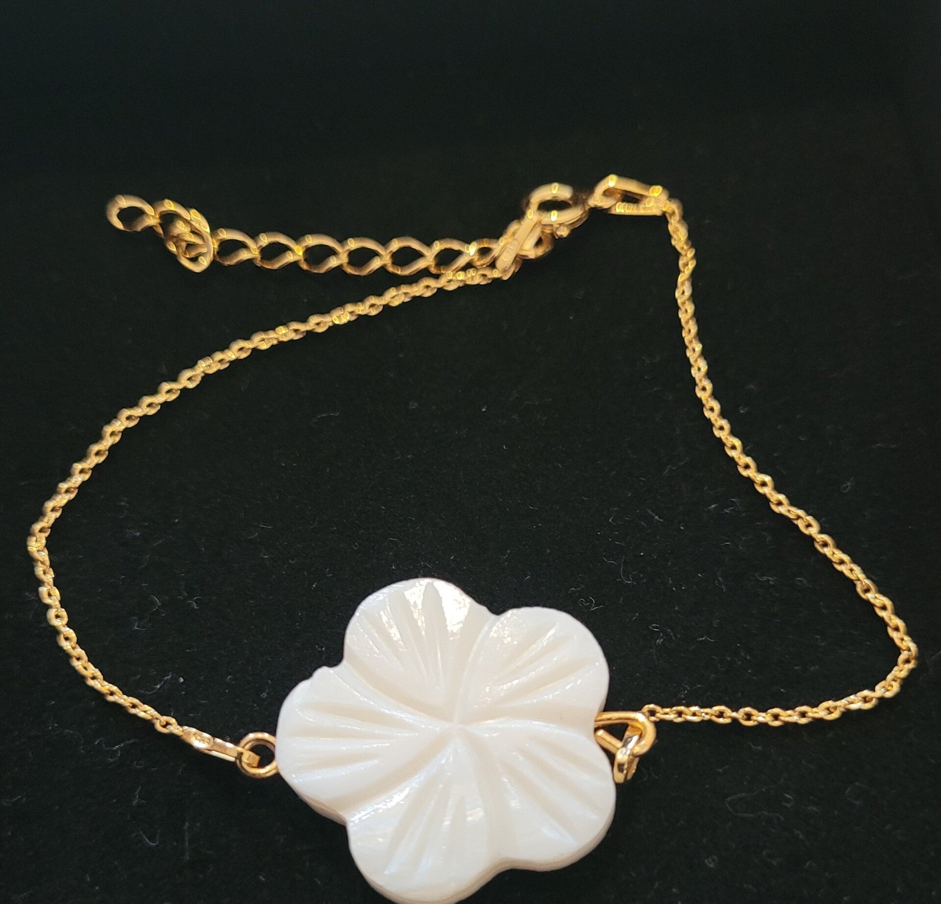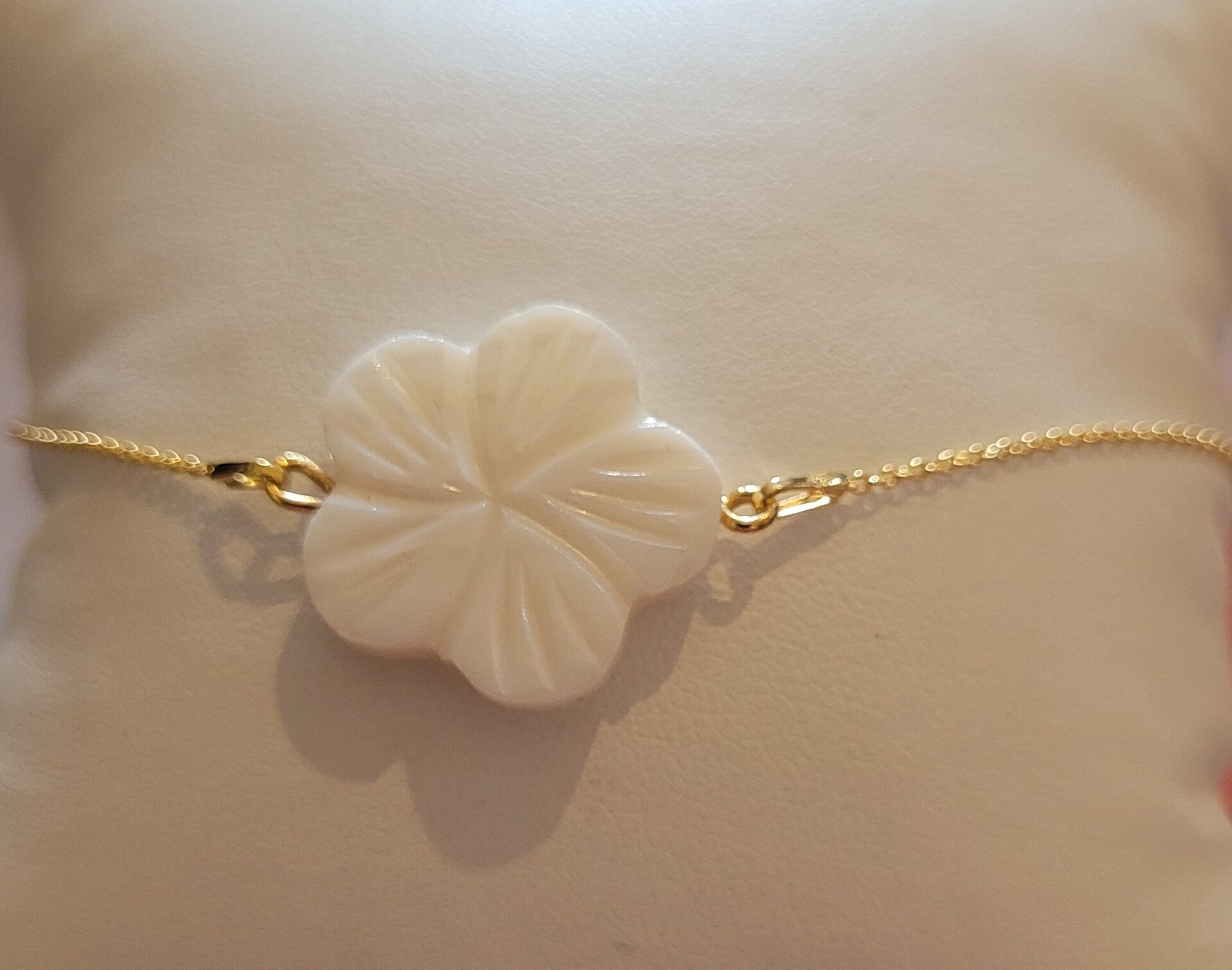 Bracelet 21cm ajustable 17cm et 5cm chainette d'extension véritable fleur sculptée en nacre fermoir anneau ressort