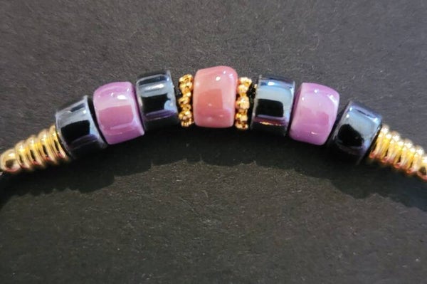 Bracelet 17cm en cuir noir perles en céramique et perles en plaqué or fermoir mousqueton en plaqué or