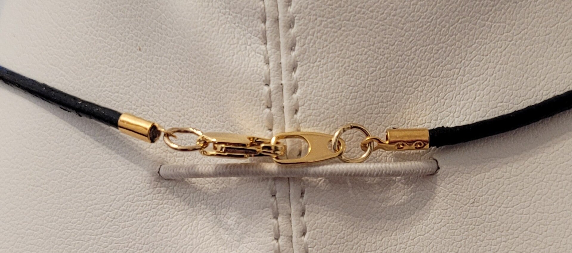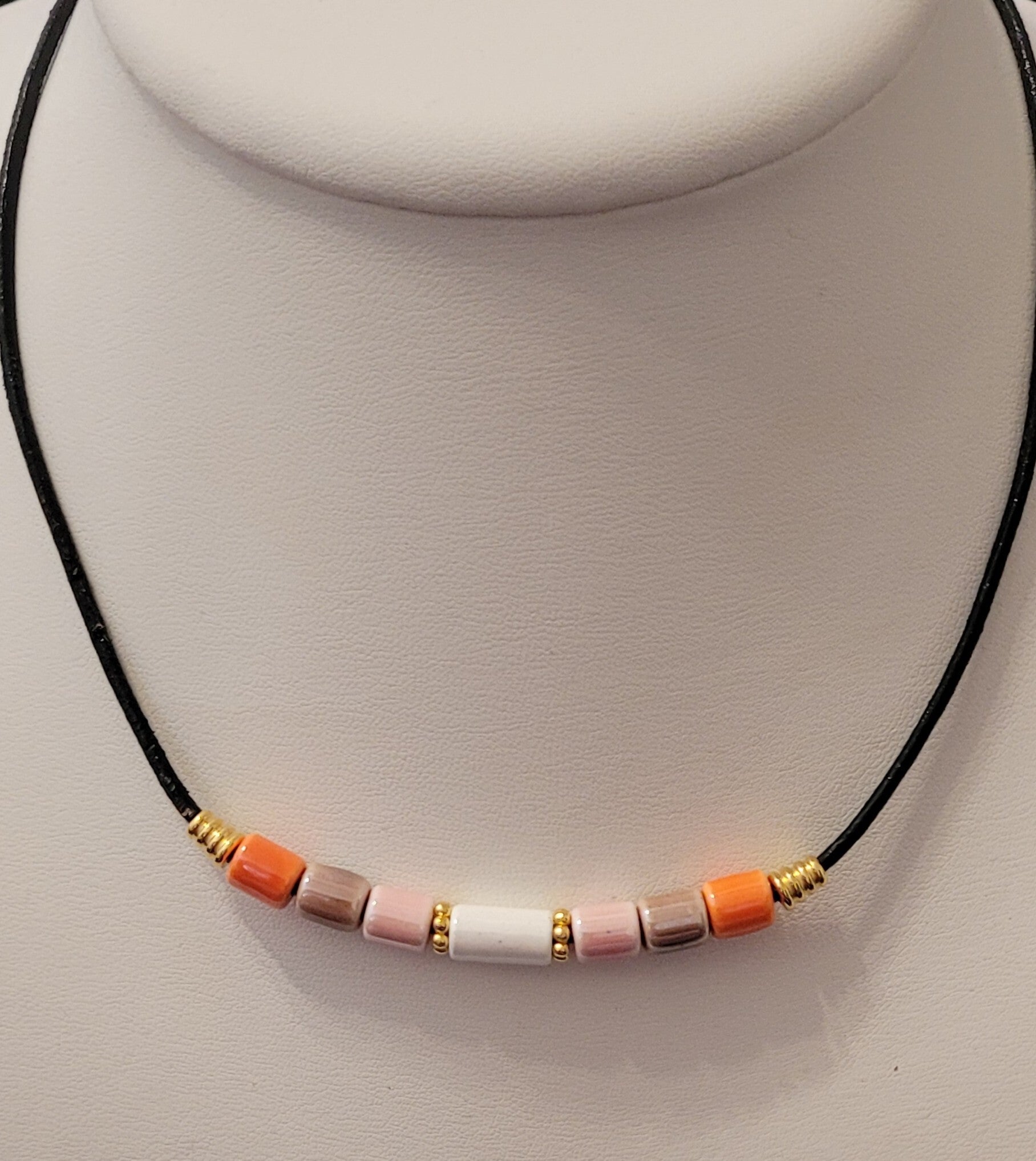 Collier ras du cou 42cm en cuir noir perles en céramique et perles en plaqué or fermoir mousqueton en plaqué or