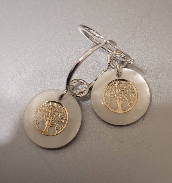 Creoles 21mm en argent 925 véritable nacre motif arbre de vie.