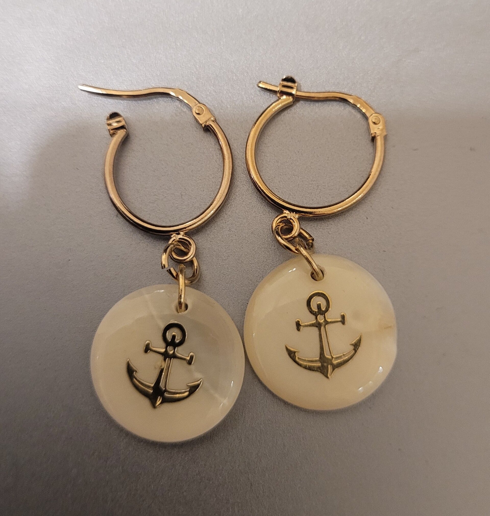 Créoles 19mm en plaqué or véritable nacre motif ancre.