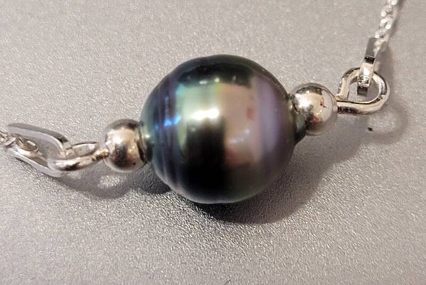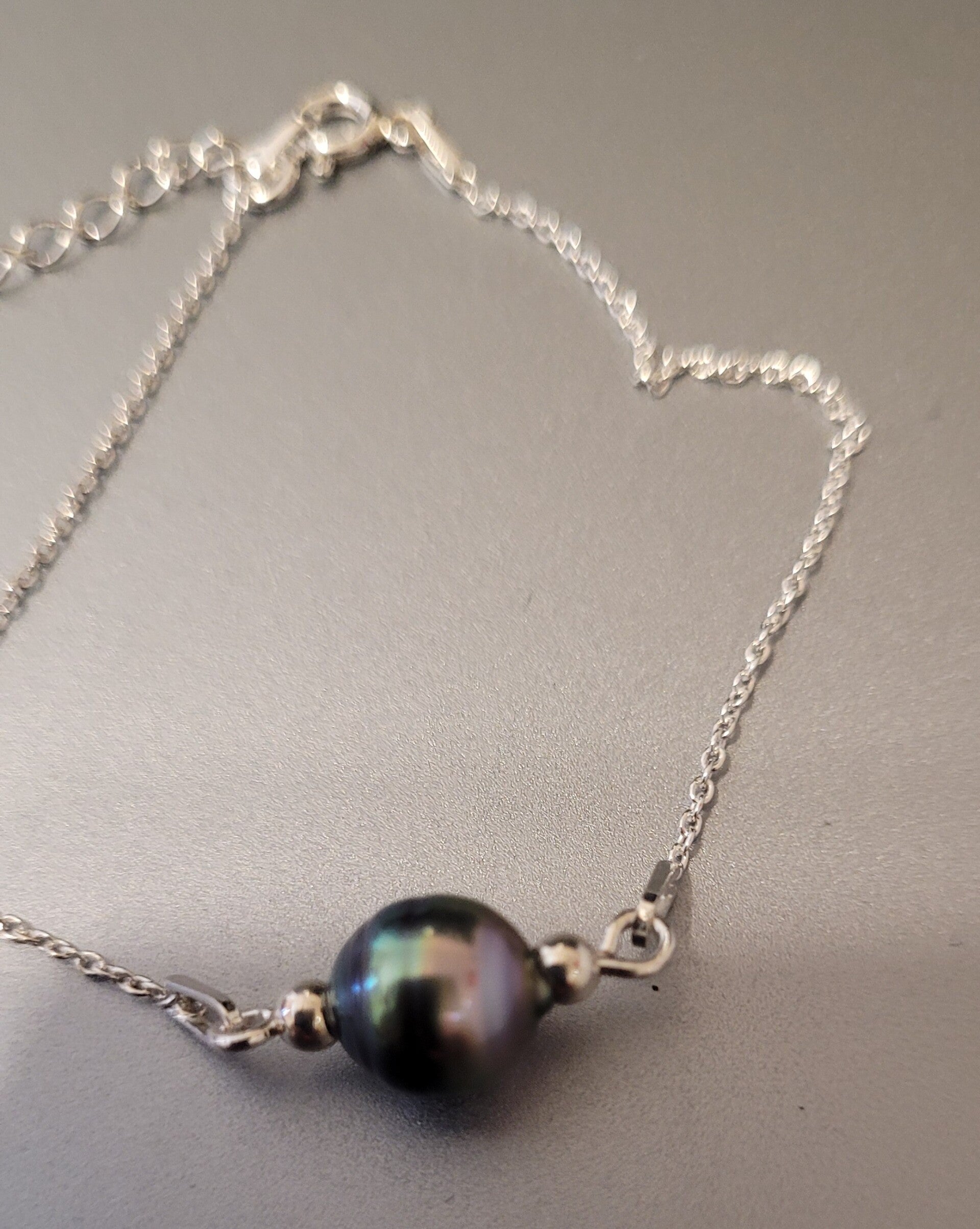 Bracelet 21cm en argent 925 ajustable 17cm et 4cm chainette d'extension véritable perle de tahiti cerclée couleur peacock diamètre 8/9mm très beau Lustre qualité B et perles en argent.