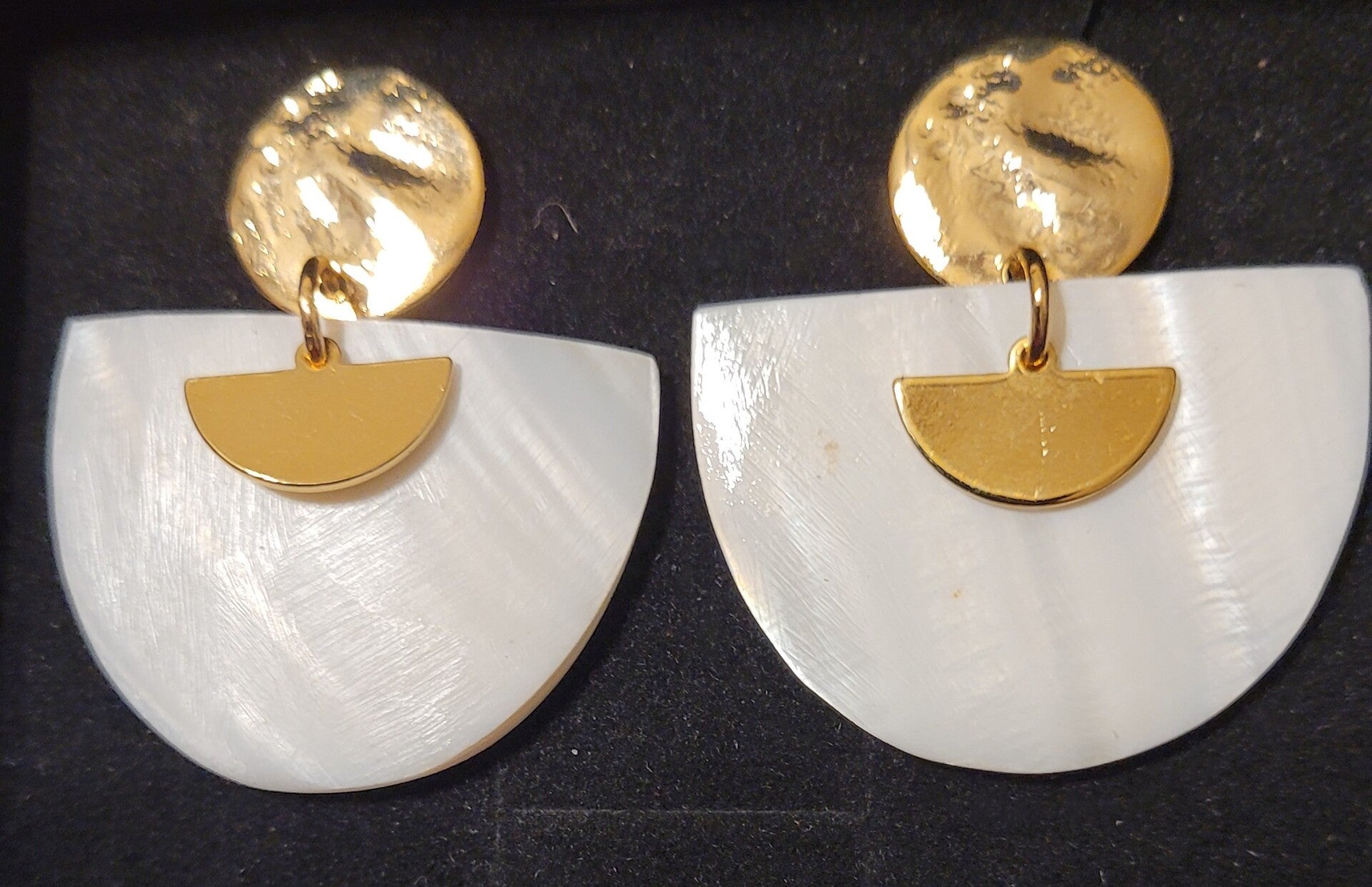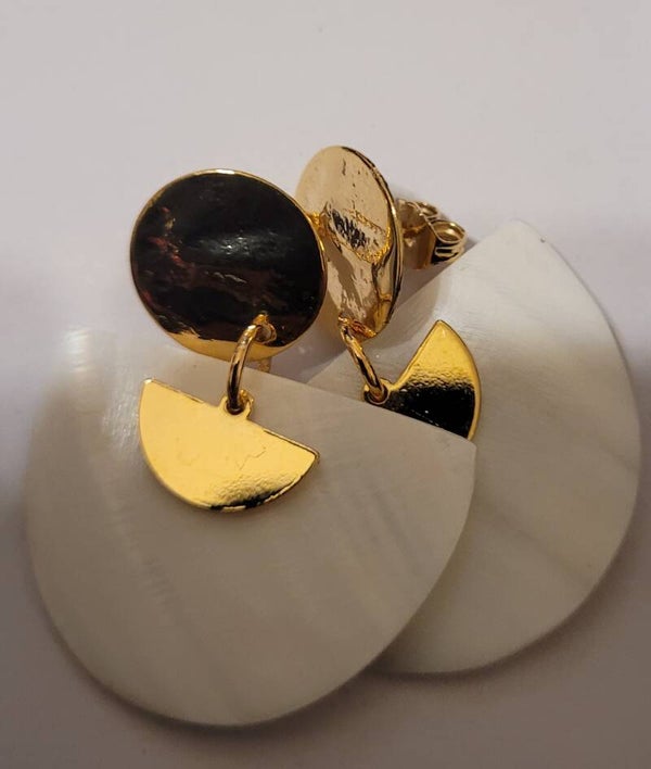 Boucles d'oreilles pendantes dorées à l'or fin véritable nacre et breloques en plaqué or. Hauteur 4cm Hauteur des pendants 2,5cm. Fermetures : poussoirs