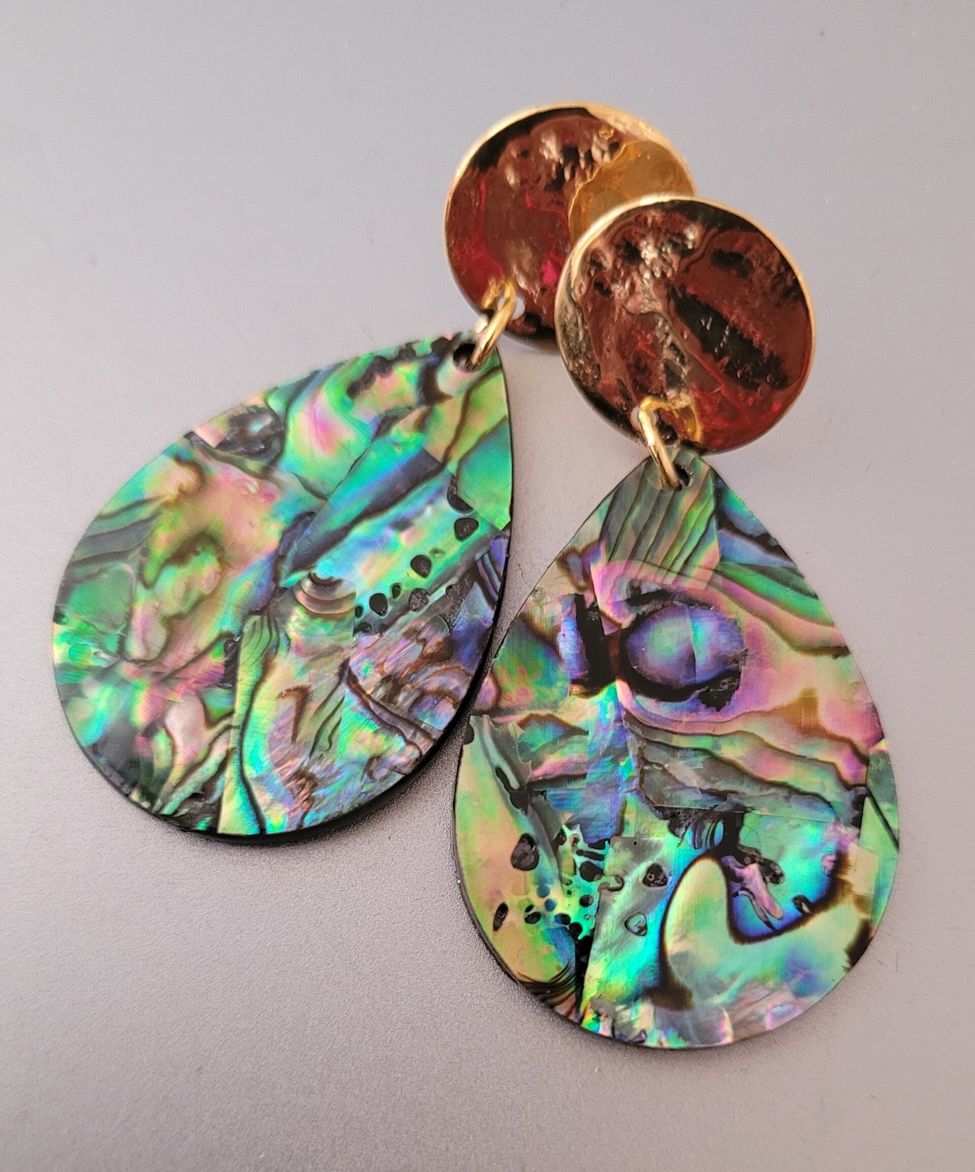 Boucles d'oreilles pendantes dorées à l'or fin véritable coquillage d'ormeau hauteur totale : 4,8 cm hauteur des pendants : 3,5 cm fermetures : poussoirs