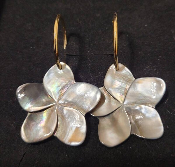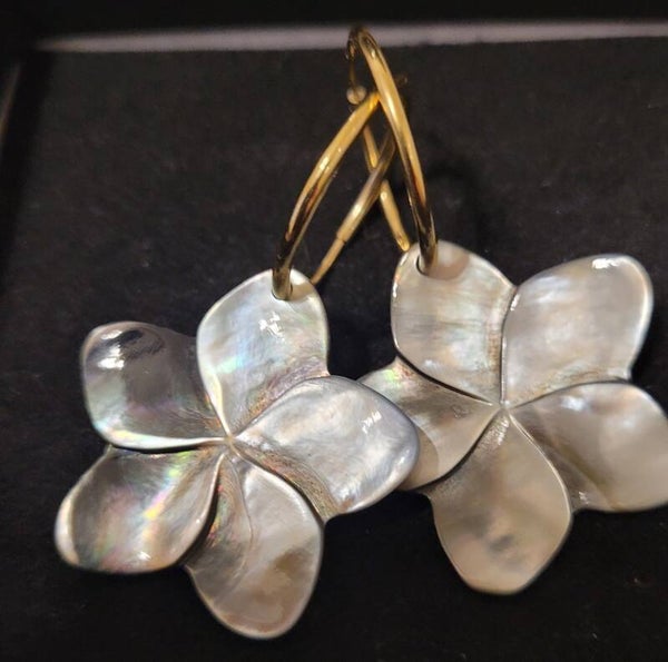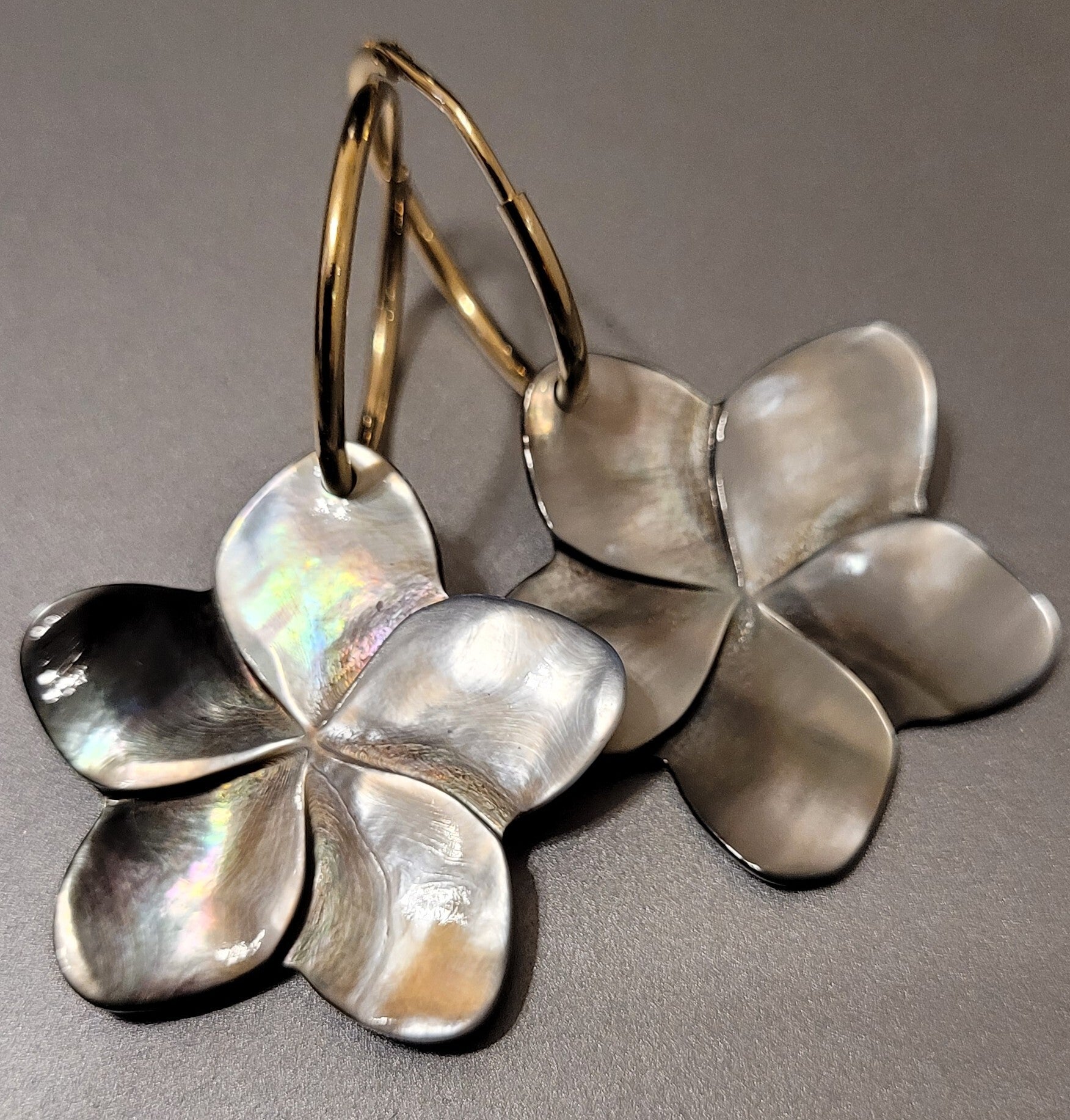 Créoles 21mm en plaqué or véritable nacre noire sculptée.