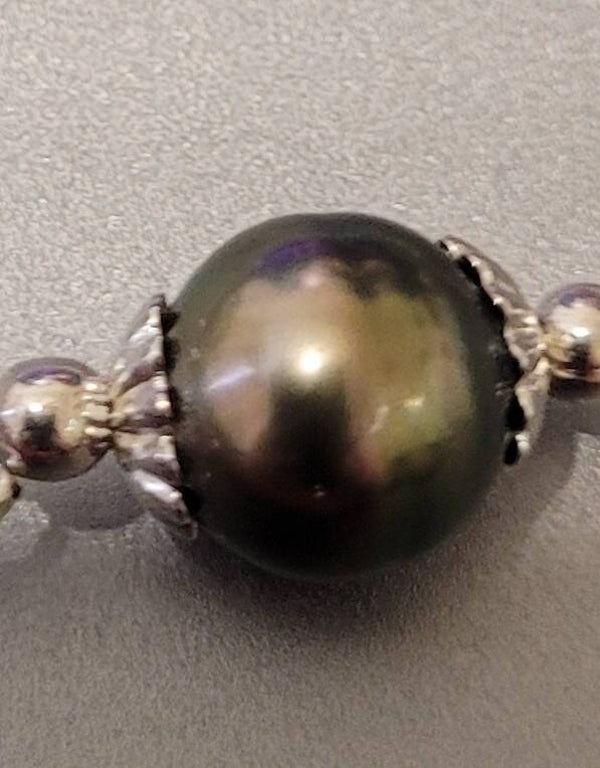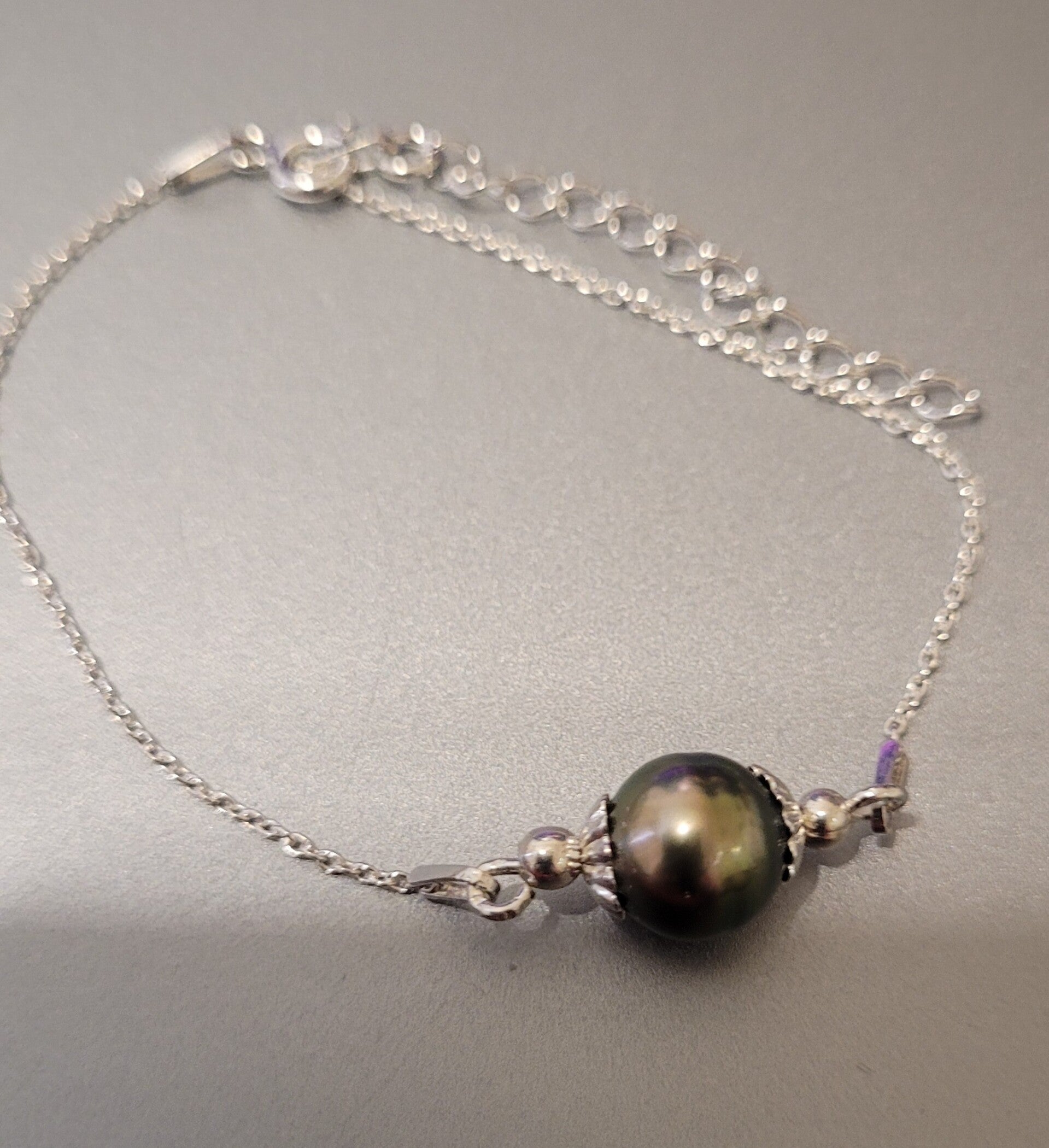 Bracelet 21cm en argent 925 ajustable 17cm et 4cm chainette d'extension véritable perle de tahiti cerclée légèrement couleur peacock vert diamètre 8/9mm qualité B très beau Lustre et perles en argent.