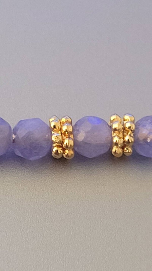 Bracelet 21cm ajustable en plaqué or 17cm et 4cm chainette d'extension perles facettées véritable pierre gemme tanzanite et perles en Plaqué or.