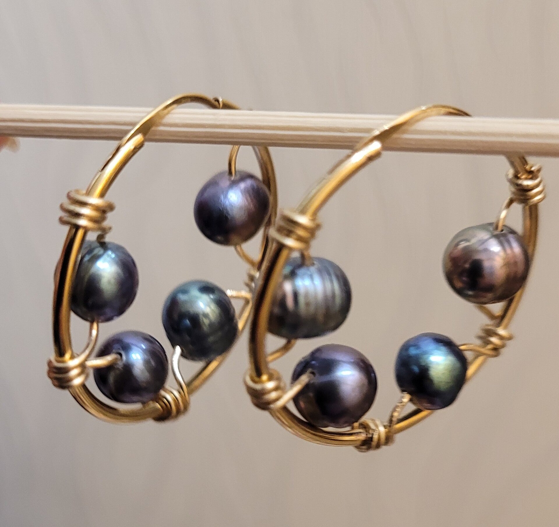 Boucles d'oreilles créoles en plaqué or 31mm et véritables perles naturelles de culture d'eau douce