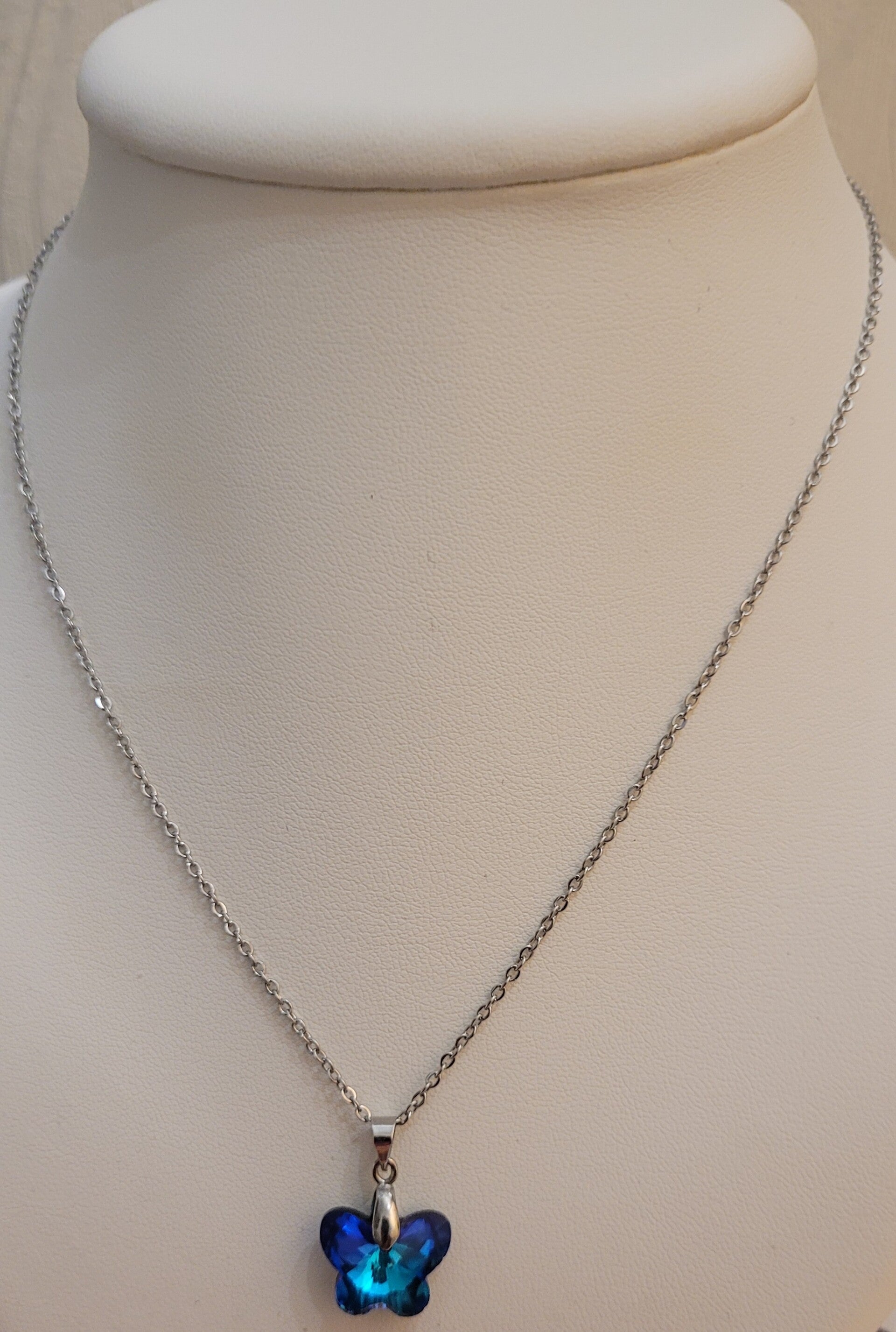Collier 45cm en métal inoxydable hypoallergénique et ravissant pendentif papillon en pur cristal de Swarovski bleu bermude
