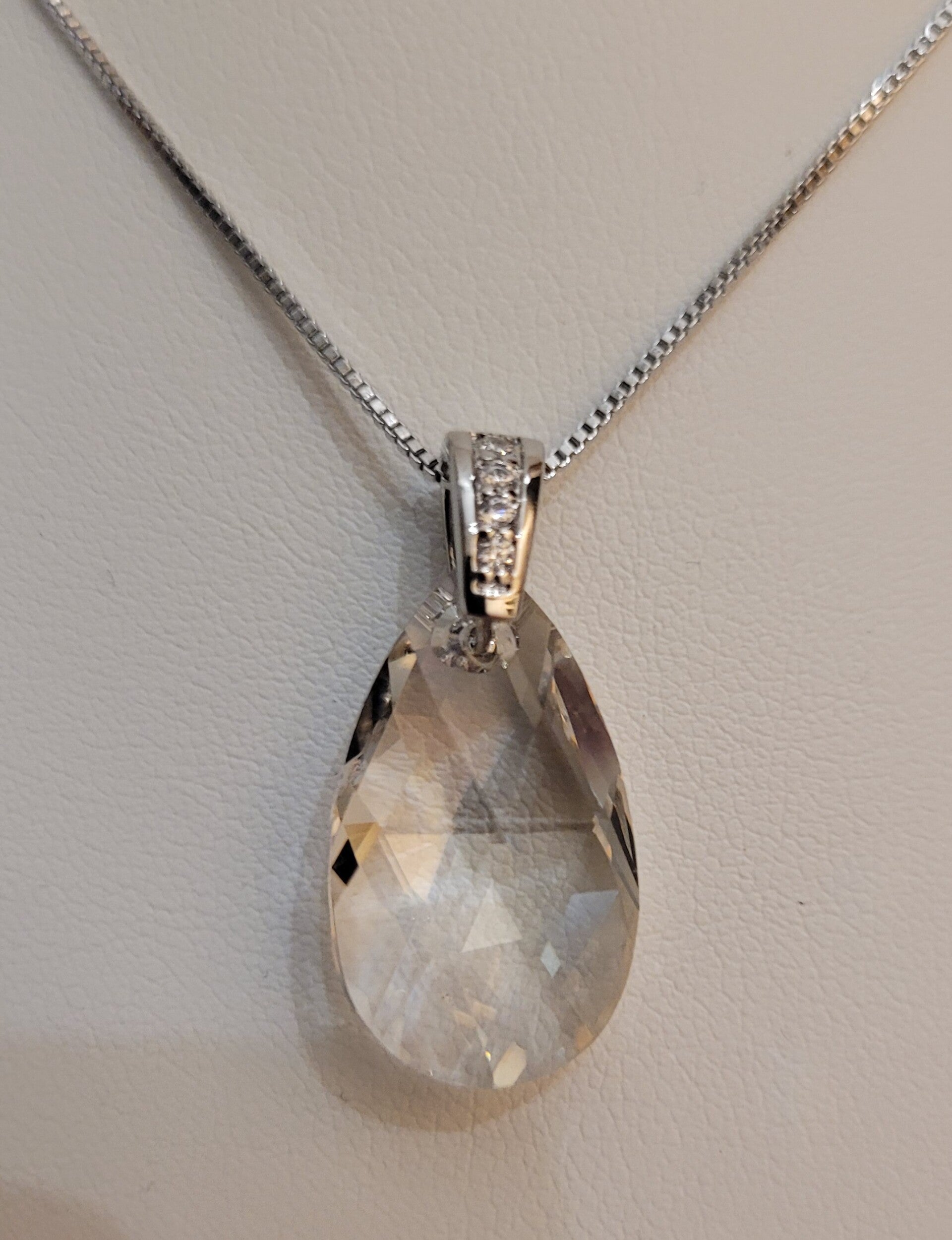 Collier 45cm en métal argenté et pendentif goutte facettée en cristal de Swarovski sylver shade